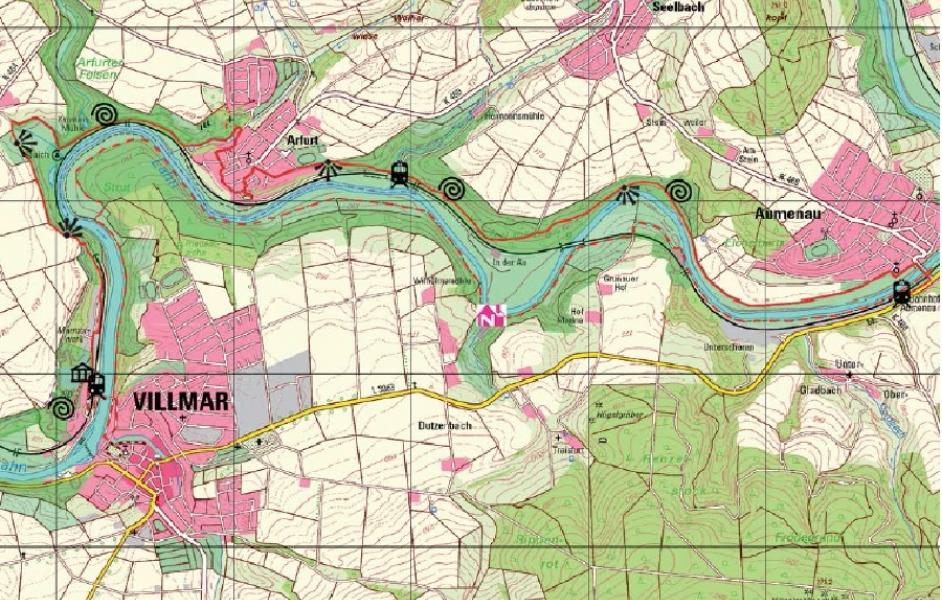 Aumenau (129 m, 1500 Ew.), heute Ortsteil des Marktfleckens Villmar, ist mit seiner Ersterwähnung (Amana um 764) der älteste Ort im Landkreis. Mit dem Bau der Lahntalbahn 1862 wurde der Ort wichtigster EisenerzUmschlagplatz der Region. Sehenswert sind die Zeugnisse des Abbaus von Eisenerz und Lahnmarmor.